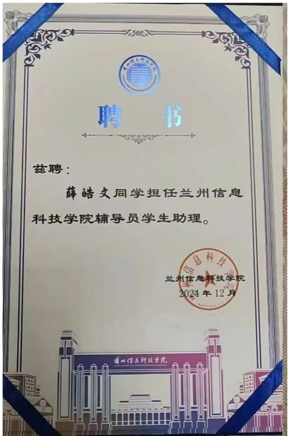 薛皓文,24岁,甘肃平凉人。2026届水利水电工程专业毕业生,在校期间担任班长,获国家励志奖学金、校三好学生、学习标兵等荣誉,同时担任辅导员学生助理。毕业之际,他并未选择专业对口的传统路径,而是通过校招进入吉利控股集团杭州吉利汽车分公司,在厂部生产管理科负责现场管理、班组考核及相关方安全协调工作。从水利到汽车,从兰州到杭州,跨度不可谓不大。但他始终记得自己的座右铭:“无可靠山,我自为山。”