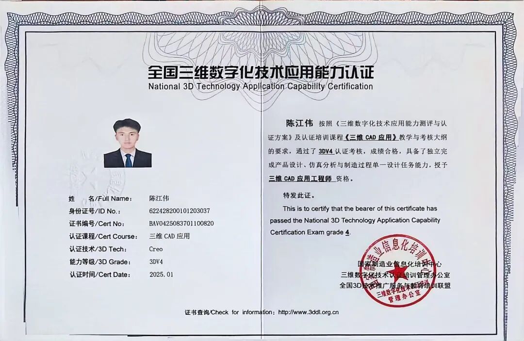 在校期间,他先后考取了CAD中级工程师证、SolidWorks证书、三维CAD应用证书。他说:“这些证书不只是纸面荣誉,每一次备考都是对专业能力的强化。”他还积极参加学院组织的技能竞赛,有一次为了完成一个复杂的三维建模题目,他和队友连续熬了两个通宵,反复调试模型,最终获得二等奖。正是这种“啃硬骨头”的精神,让他在求职时拥有了比同龄人更扎实的实操能力。
