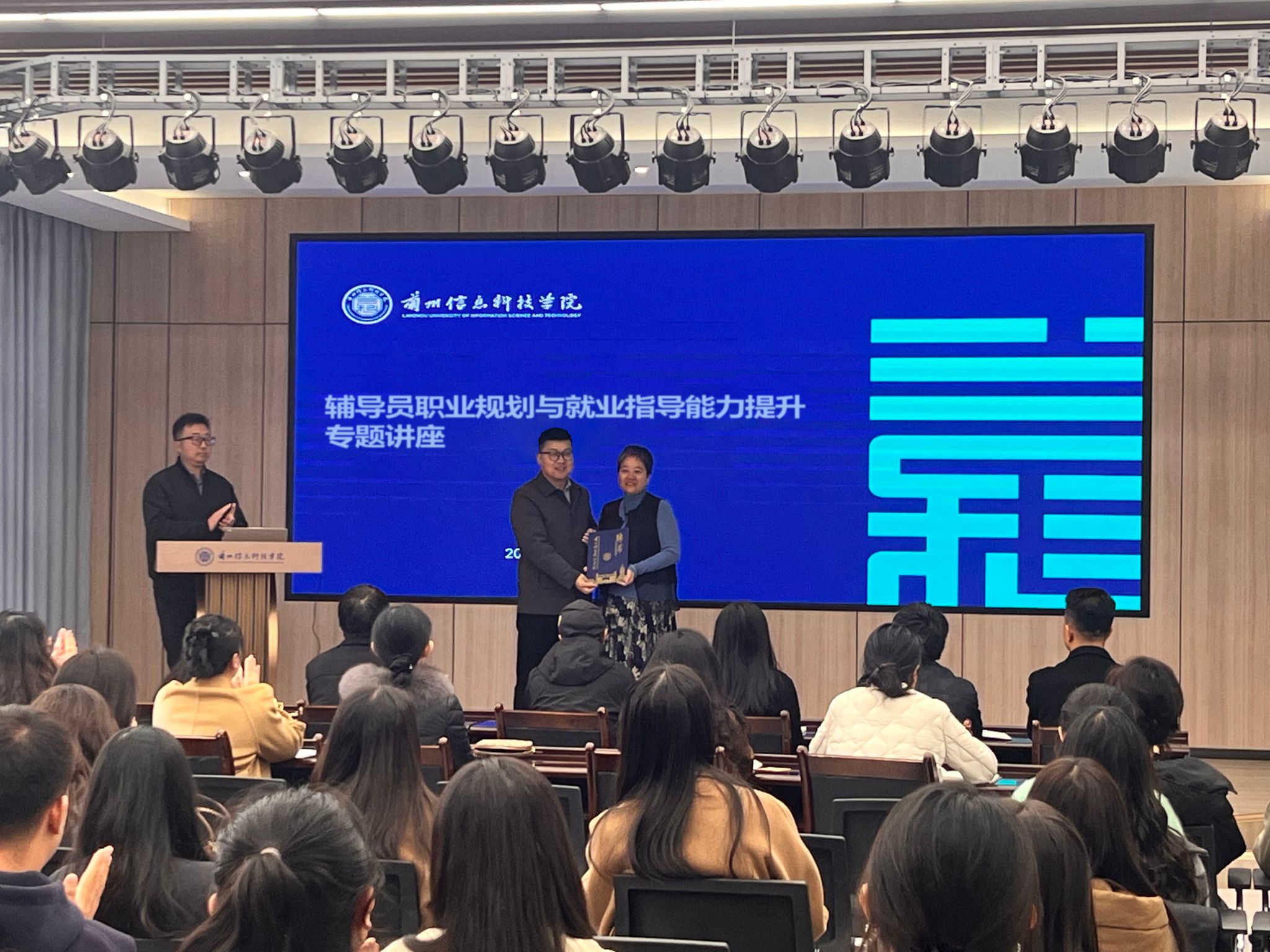 讲座伊始,学校校长助理苏存兴对李红教授的到来表示了热烈的欢迎,并对李教授的学术背景和丰富经验进行了详细介绍。为进一步加深与我校的合作与交流,学校聘请李红教授为“客座教授”,并由校长助理苏存兴副教授为李教授颁发了聘书。这一举措不仅为我校辅导员队伍的建设注入了新的活力,也为今后双方在职业规划与就业指导领域的深入合作奠定了良好的基础。