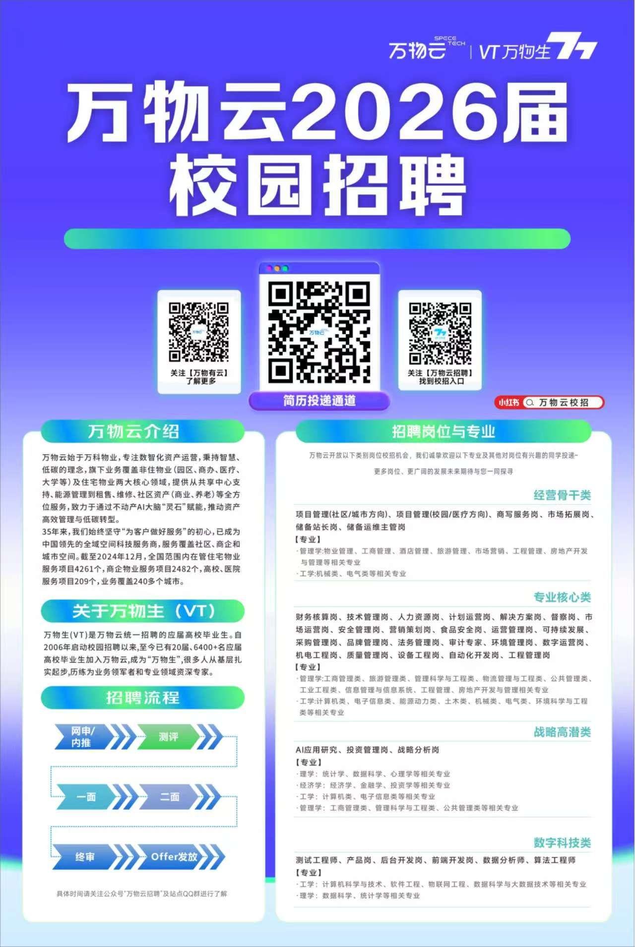 * 岗位发布及更多其他岗位详情以万物云校园招聘官网(https://vt.onewo.com)为准。